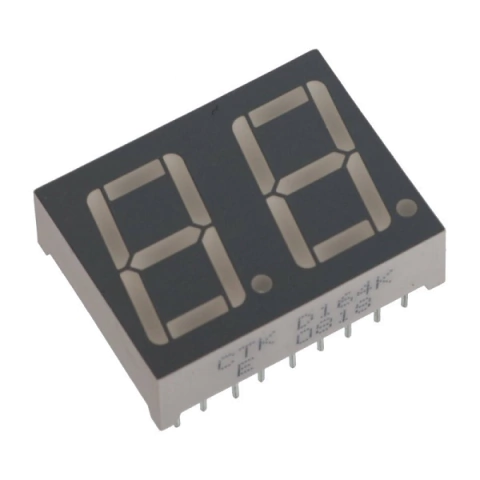 Este é um display LED padrão de 7 segmentos e 2 dígitos na cor vermelho, configuração catodo comum. Muito usado em projetos eletrônicos como contadores e relógios.