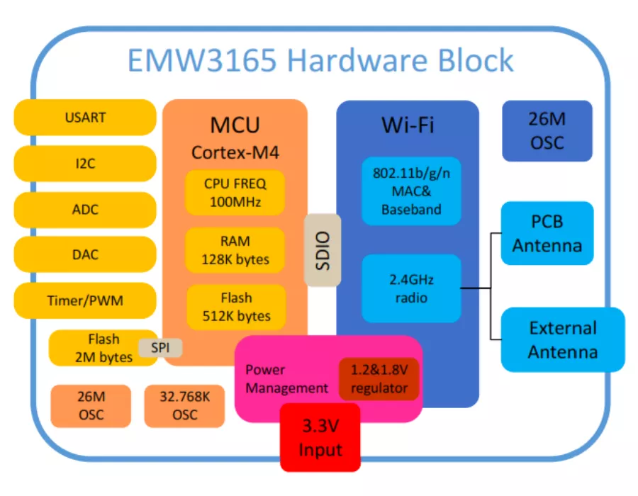 O EMW3165 é um módulo WiFi de baixo consumo de energia, desenvolvido pela Shanghai MXCHIP Technology. Ele incorpora um chip RF WiFi e um microcontrolador baseado no STM Cortex-M4. O módulo WiFi inclui uma biblioteca de rede WiFi "self-hosted" e componentes de aplicações. Além disso, também fornece 2 MB de flash out-chip, 512 kB de flash on-chip, 128 kB de RAM e vários recursos periféricos.